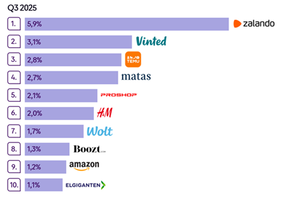 Raportul a analizat si cele mai populare magazine e-commerce din tara nordica. Vinted a intrat pentur prima data in clasament, pe locul al doilea, cu 3,1% market share. Prima pozitie este ocupata de Zalando (5,9%).