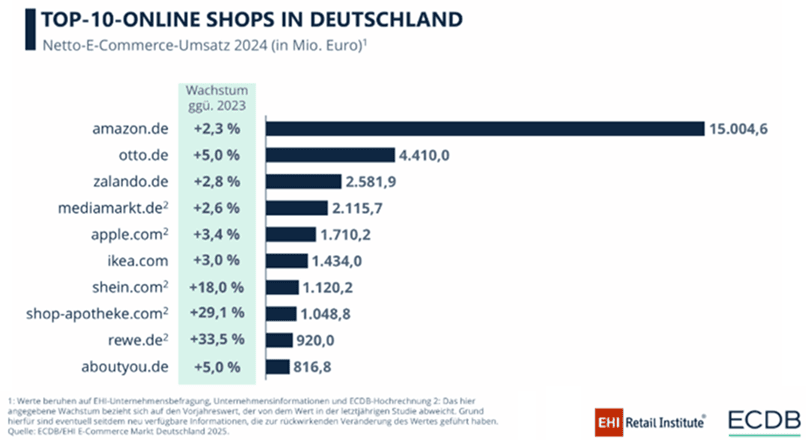 Amazon.de este si cel mai mare marketplace din tara vestica (cu 52 miliarde € si +4,2% YoY), mult inaintea eBay.de (8,7 miliarde € si -1,3% YoY), otto.de (7,08 miliarde € si +9% YoY), zalando.de (4,05 miliarde € si +3,9% YoY) si temu.com (3,42 miliarde € si +284% YoY).