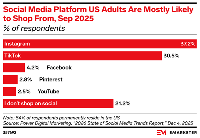 Sondajul de opinie a fost realizat in septembrie 2025, pe un esantion de 1.483 de amerciani de pest 18 ani, de Power Digital Marketing. Asta inseamna ca echipele de marketing si brandurile americane ar trebui sa se axeze pe promovarea produselor/serviciilor lor pe Instagram si TikTok: parteneriate cu influenceri, native product tags, continut short-form.